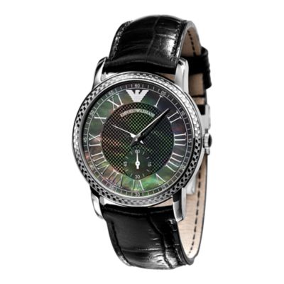 This classic women's watch has an effortlessly sophisticated look you'll love. The stainless steel case features a textured bezel and a black mother of pearl dial with roman numeral hour markers. A black leather croco-embossed strap adds the finishing touch.